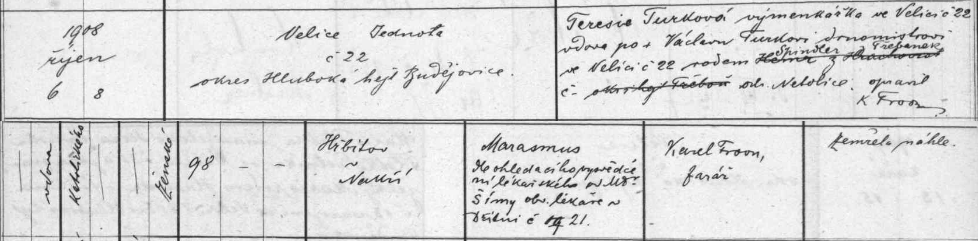 | Úmrtí | 1908-10-06 | Velice, č. 22 | marasmus | 1a |